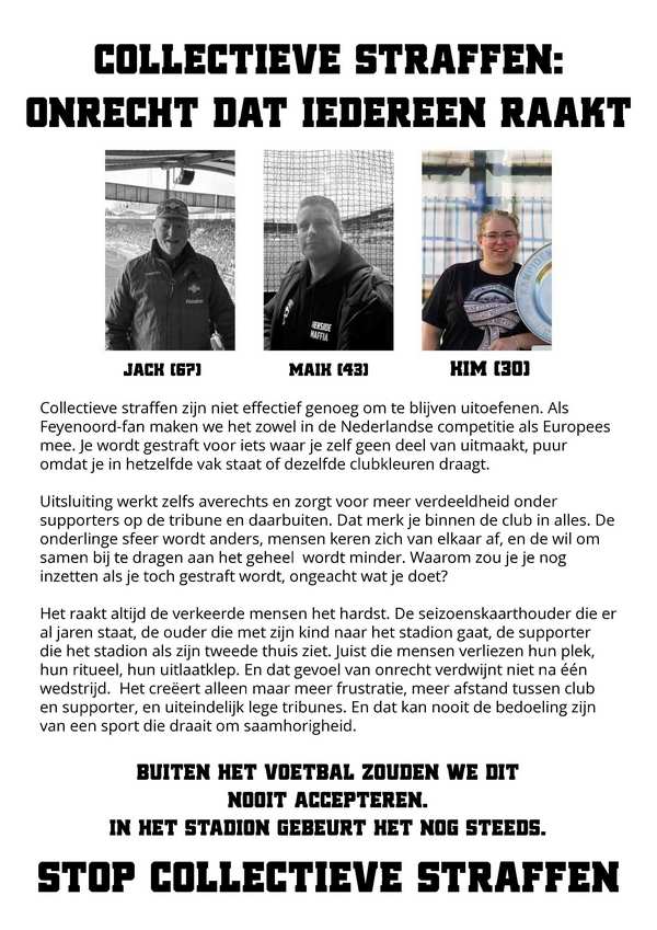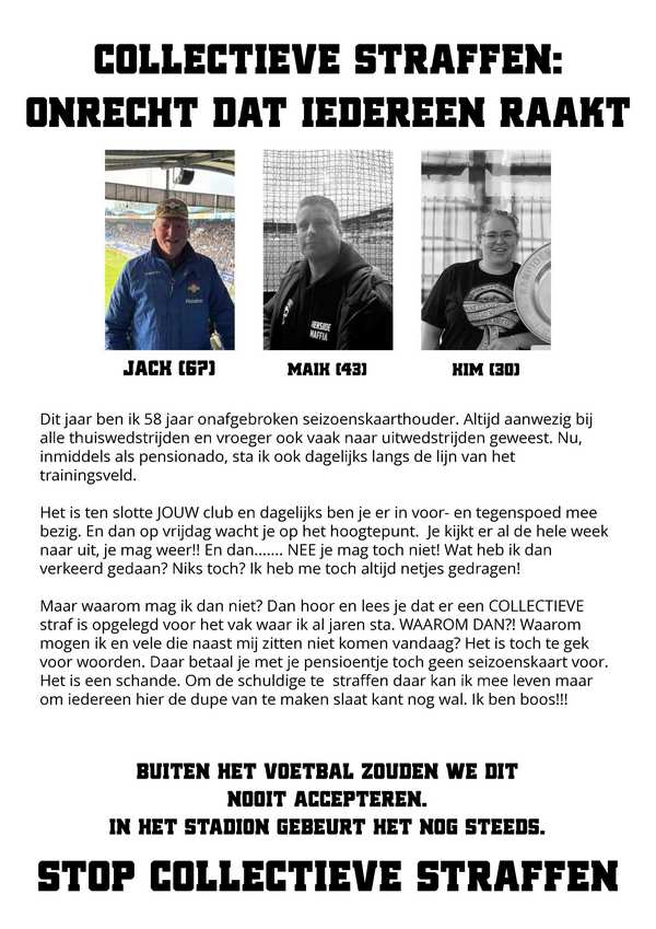 Zolang collectieve straffen bestaan, is die zekerheid er niet. Dan kan niemand er zeker van zijn dat hij welkom is bij een wedstrijd. Ook mensen die niets verkeerd hebben gedaan. Ook Marijke en Peter niet.