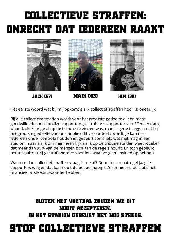 Wij roepen alle clubs op om deze stap te zetten. Om dit onderwerp op de agenda van de AVBV van de KNVB te plaatsen en daar te stemmen voor het schrappen van collectieve straffen.
