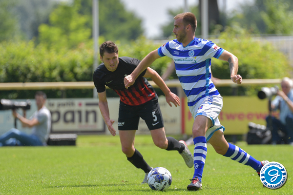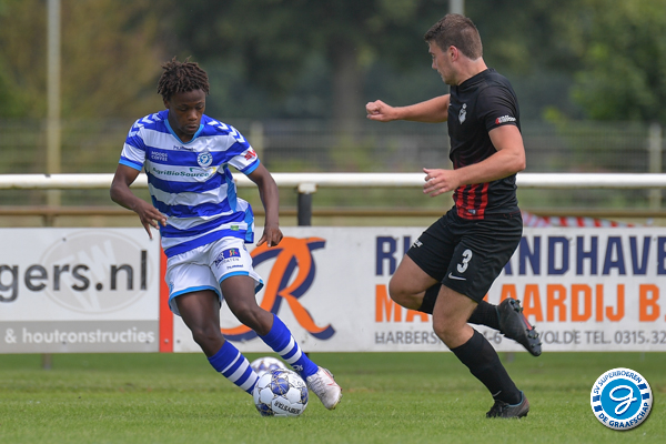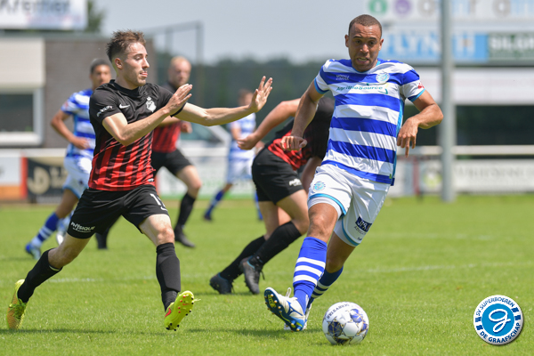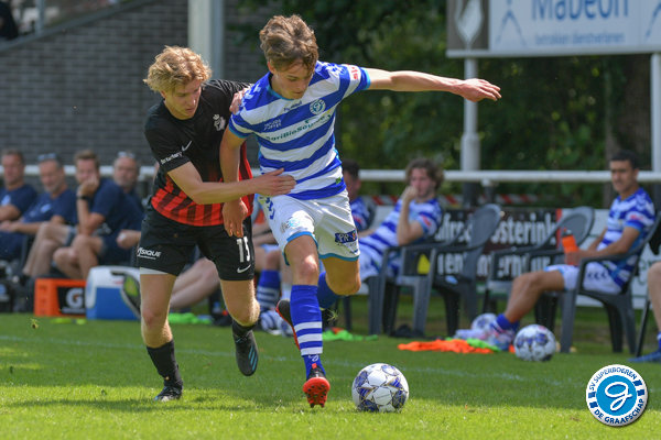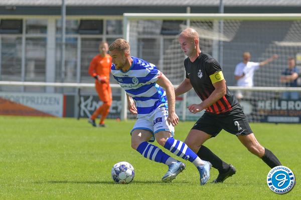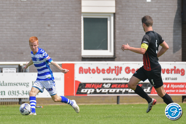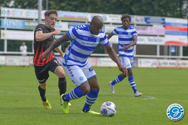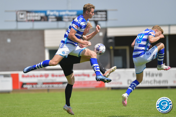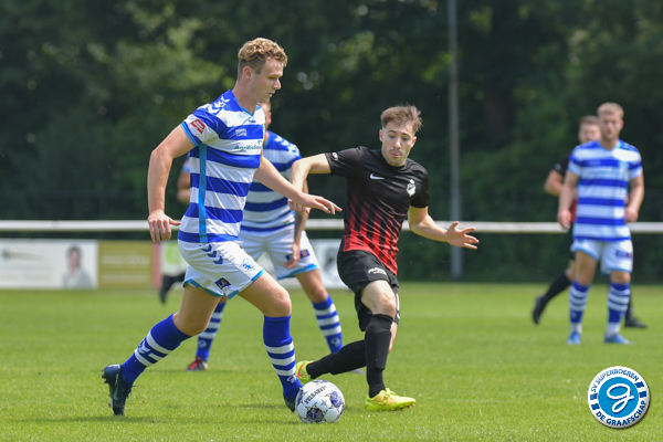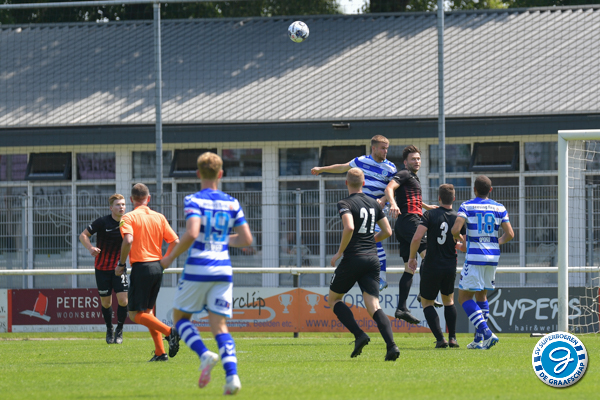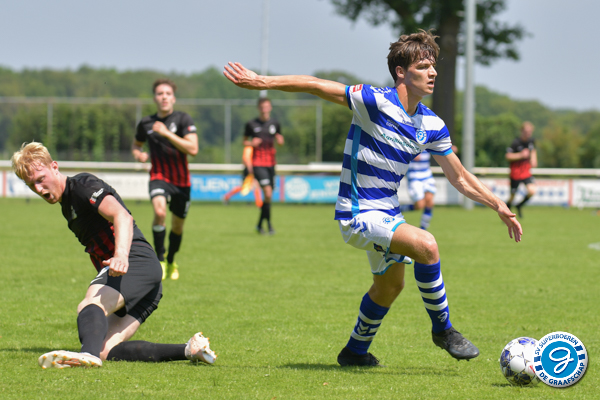 Tot aan de drinkpauze van wege het warme weer gebeurde er weinig tot niets. Hoogtepunt was de enige gele kaart die vanmiddag viel voor Pim Olthuis na een overtreding op Joey Konings. Na een half uur kwam De Graafschap op 0-1. Via Jonathan Opoku belandde de bal op links bij Camiel Neghli, zijn voorzet werd door Olthuis achter zijn eigen keeper gewerkt.