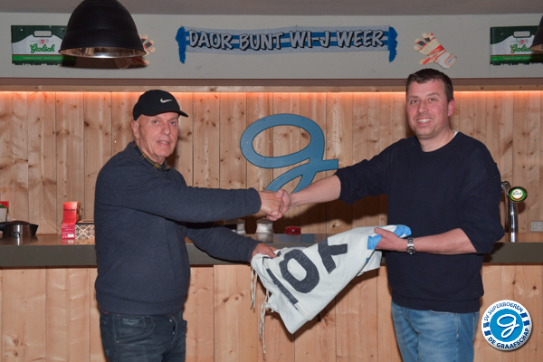 Jarenlang heb ik gedacht dat het verloren was gegaan. Ik had er geen actieve herinnering meer aan van wie dat spandoek was, totdat vorige week een medesupporter mij vertelde de eigenaar te kennen en dat het doek mogelijk nog weleens op zolder zou kunnen liggen… Een belletje was snel gepleegd en na enig speurwerk bleek het spandoek nog intact en gewassen 20 jaar geleden, door de moeder van Dennis Daams, de eigenaar van het spandoek! Dennis wilde het spandoek graag schenken aan onze supporterskantine. Ben Roelofs bestuurslid van de SV Superboeren, mocht het vandaag in ontvangst nemen uit handen van Dennis en zijn zoons. De heren hebben gelijk een mooie plek bedacht om hem op te hangen; Boven het podium!