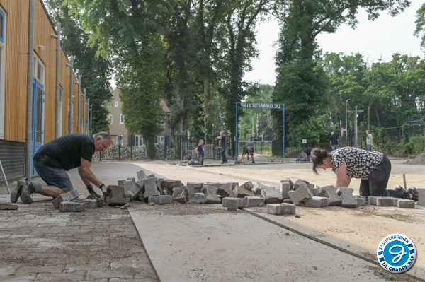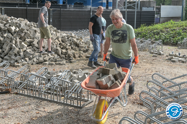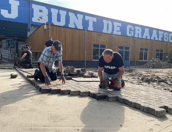 Het weer was prachtig "straatweer" en vol gas gingen we weer D'ran. Gebr. Bulten voerde de stenen weer aan met een kraantje samen met kraantje van Boels welke belangenloos ter beschikking werd gesteld. Ook kampioensbakker Paul Berntsen kwam weer lekkere dingen afleveren voor bij de koffie.
