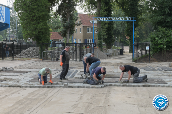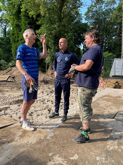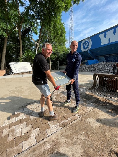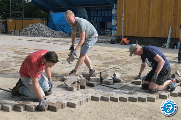 Nadat kersverse trainer Reinier Robbemond vakkundig de eerste D'ran tegel naar de juiste plaats had gereden, heeft hij deze tegel samen met voorzitter van SV Superboeren, Hans Boesberg, op de juiste plek gelegd. Daarna kunnen de vrijwilligers onder leiding van Wimpie beginnen aan de mega klus.