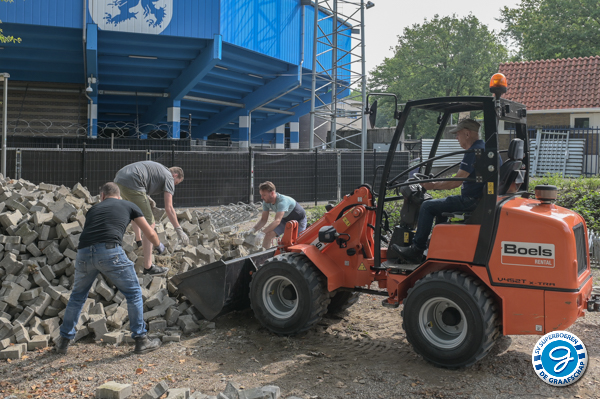 Gebr. Bulten voert de stenen aan met een kraantje waardoor er flink wat meters gemaakt kunnen worden. Door het warme weer was het soms afzien maar aan het einde van de dag kunnen we onder het genot van een biertje terug kijken op een geslaagde dag.