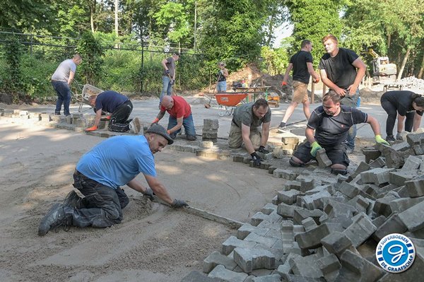 Zaterdag 3 juli 2021 Vandaag stond de 1e dag voor het straatwerk op het programma. Wat een klus. 1000 meter klinkers er in leggen met vrijwilligers. Wie bedenkt dit en hoe gaan we hier mensen voor vinden.