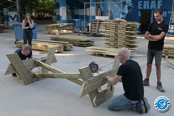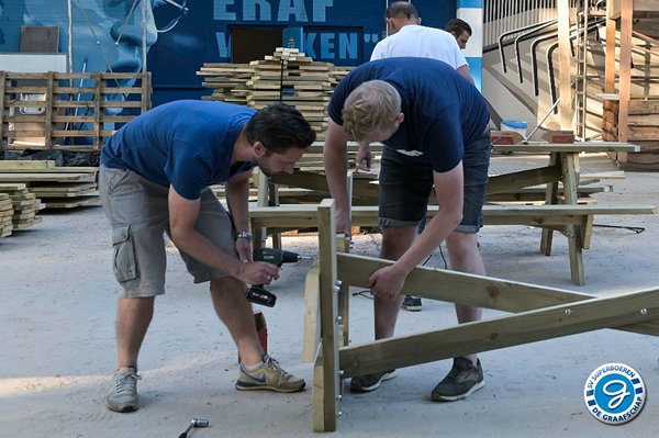 Onder toeziend leiding van mensen van Westerveld en Nederlof en SV Superboeren werden 's middags met een aantal vrijwilligers de eerste picknickbanken in elkaar gezet.