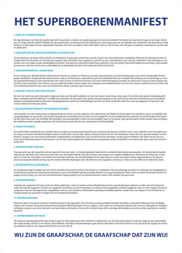 In het Superboerenmanifest staan 11 kernwaarden die, wat ons betreft, de basis vormen van onze mooie club. Hierin staan de kernwaarden voor zaken zoals visie, beleid en voetbaltechnische beslissingen waar de club ten alle tijden aan moet voldoen.