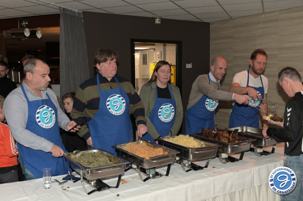 Na het officiele gedeelte met de huldiging van de jubilarissen was het tijd voor de spelers, technische staf en overig personeel om de stampotten uit te serveren aan alle vrijwilligers.