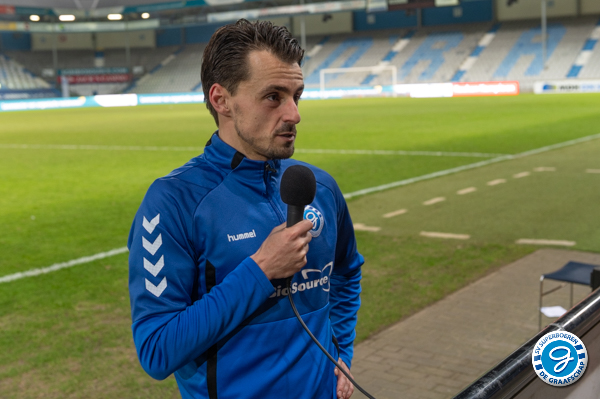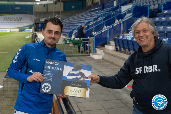Een mooi initiatief van de supportersvereniging, die samen met kledingzaak ‘De Heren van 0314’ en Bas Ballonvaarten de Man of the Match nieuw leven heeft ingeblazen. Jammer genoeg nog steeds niet in een bomvolle supporterskantine, maar buiten, werd de vijfde Man of het Match van het kalenderjaar gehuldigd: Daryl van Mieghem. Hans Hissink sprak hem na de wedstrijd, na het overhandigen van de kadobon van 200 euro door Mariska Bais.