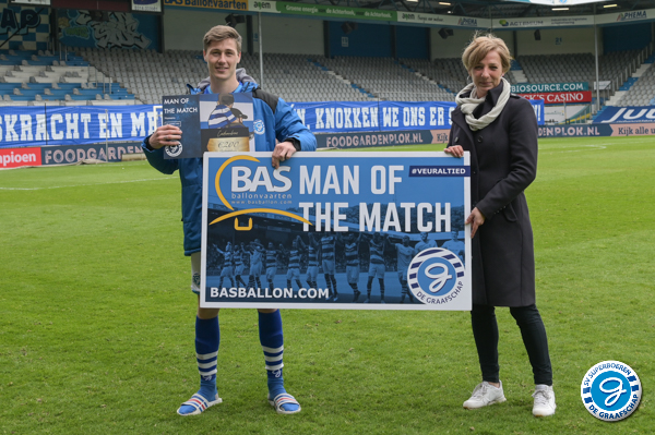 Een mooi initiatief van de supportersvereniging, die samen met kledingzaak ‘De Heren van 0314’ en Bas Ballonvaarten de Man of the Match nieuw leven heeft ingeblazen. Tijdens de wedstrijd De Graafschap - Go Ahead Eagles werd Jesse Schuurman bekroond tot de man van de webstrijd. Hans Hissink sprak hem na de wedstrijd, na het overhandigen van de kadobon van 200 euro door Mariska Bais.