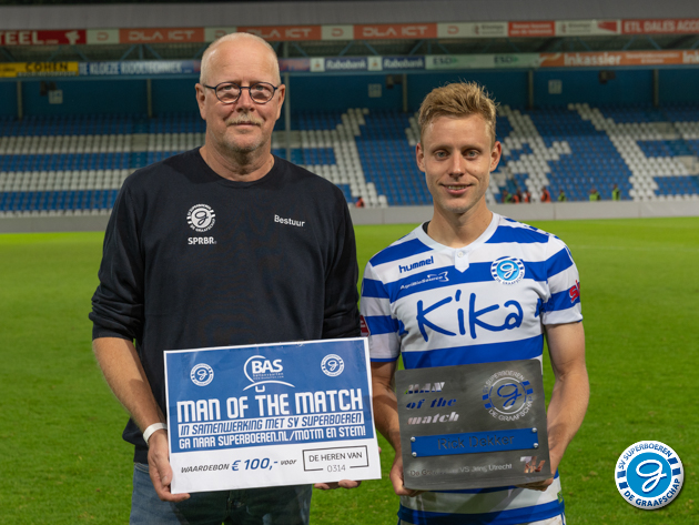 Tijdens de wedstrijd De Graafschap - Jong FC Utrecht werd Rick Dekker bekroond tot de man van de wedstrijd. Hans Hissink sprak hem na de wedstrijd. Luister hieronder naar zijn interview. Boudewijn Mecking mocht hem namens SV Superboeren en kledingzaak 'De Heren van 0314' een kadobon van 100 euro overhandigen. Het aandenken is door Ter Horst Groep aangeboden.