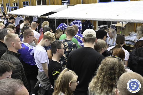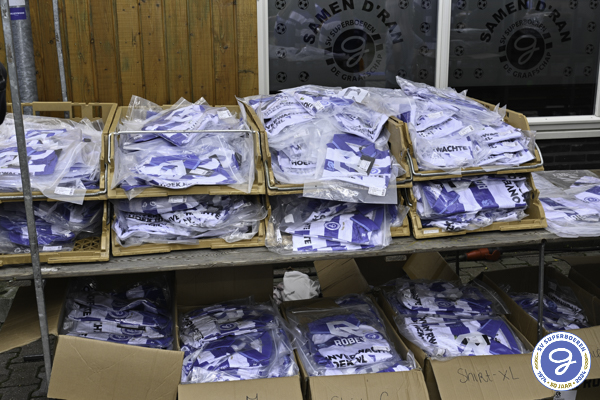 Bij de verkoopkraampjes gingen veel fan artikelen over de toonbank. Ook de nieuwe wedstrijdshirts vonden gretig aftrek.