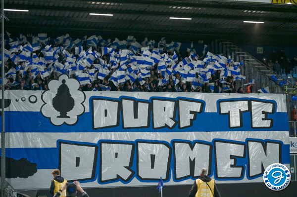 Een sfeervol uitvak toonde aan de start van de wedstrijd een spandoek met ’Durf te dromen’. Zou het De Graafschap gaan lukken om dit seizoen verder te komen in de KNVB Beker? Vorig seizoen zegevierden de Achterhoekers bij FC Twente (1-3) en ging het op De Vijverberg met 1-2 onderuit tegen PSV.