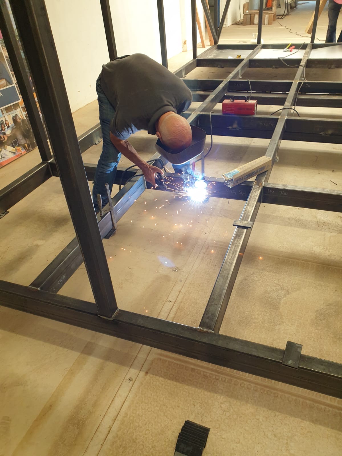 In de werkplaats van Westerveld & Nederlof zijn vrijwilligers van de SV samen met personeel van Westerveld & Nederlof BV, begonnen met de bouw van het verkooppunt.