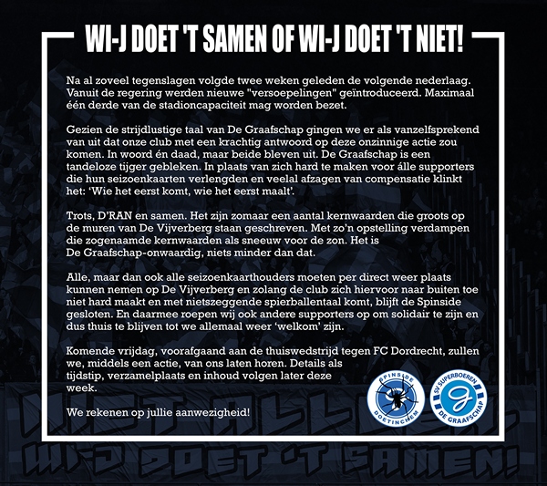 Alle, maar dan ook alles seizoenskaarthouders moeten per direct weer plaats kunnen nemen op De Vijverberg en zolang de club zich hiervoor naar buiten toe niet hard maakt en met nietszeggende spierballentaal komt, blijft de Spinside gesloten. En daarmee roepen wij ook anders supporters op om solidair te zijn en dus thuis te blijven tot we allemaal weer "welkom" zijn.