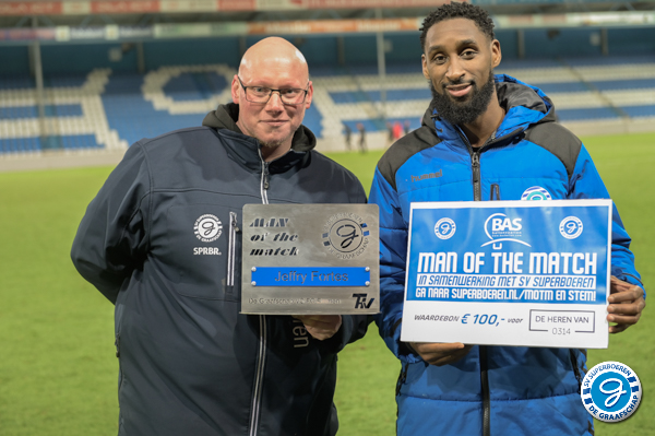 Tijdens de wedstrijd De Graafschap - FC Emmen (1-1) werd Jeffry Fortes bekroond tot de man van de wedstrijd. Hans Hissink sprak hem na de wedstrijd. Luister hieronder naar zijn interview. Dave Jansen mocht hem namens SV Superboeren en kledingzaak 'De Heren van 0314' een kadobon van 100 euro overhandigen. Het aandenken is door Ter Horst Groep aangeboden.